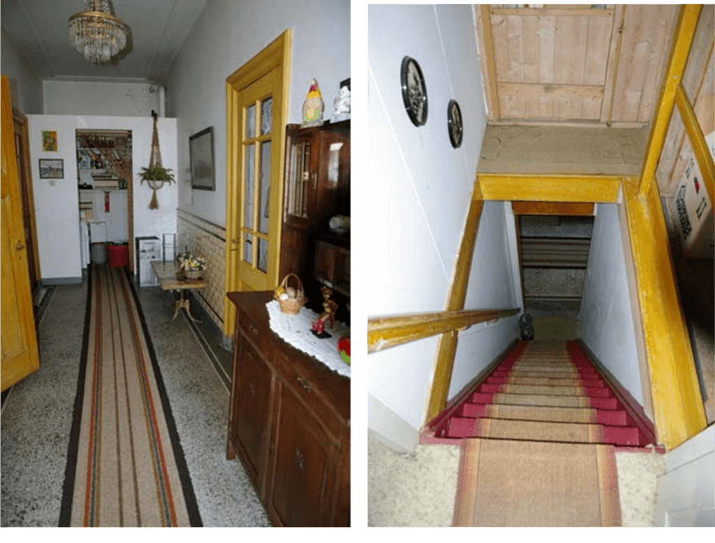 De hal loopt over de hele breedte van het gebouw en zit op de grens tussen het woongedeelte en de stal. Deze ruimte heeft een granito vloer, plafonds met stucwerkmotief, tegellambrisering en paneeldeuren met houtimitatie.