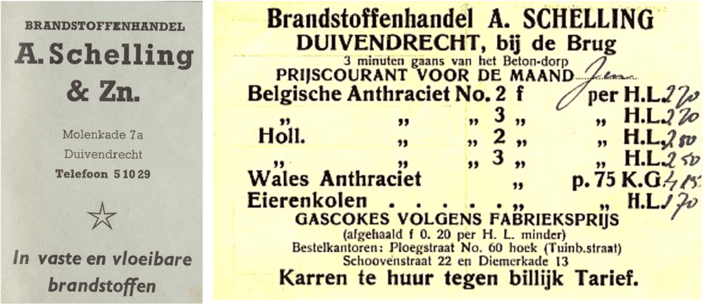 De kolenauto werd ook gebruikt om de kolen bij de mensen af te leveren. Dat ging per mud (100 liter, voor kolen al gauw 40-50 kg!), verpakt in juten zakken. Schelling ging dan met die zware zakken de trappen op in Duivendrecht, de Watergraafsmeer en in Betondorp. Er was antraciet (de duurdere soort kolen, die ook langer brandden), eierkolen, turfbriketten en ook aanmaakhout. Later werd er ook benzine verkocht; moeder Schelling was pompbediende. Dit heeft niet zo heel lang geduurd. Toen Nederland aan het gas ging in de jaren-60, hield de kolenhandel op te bestaan.