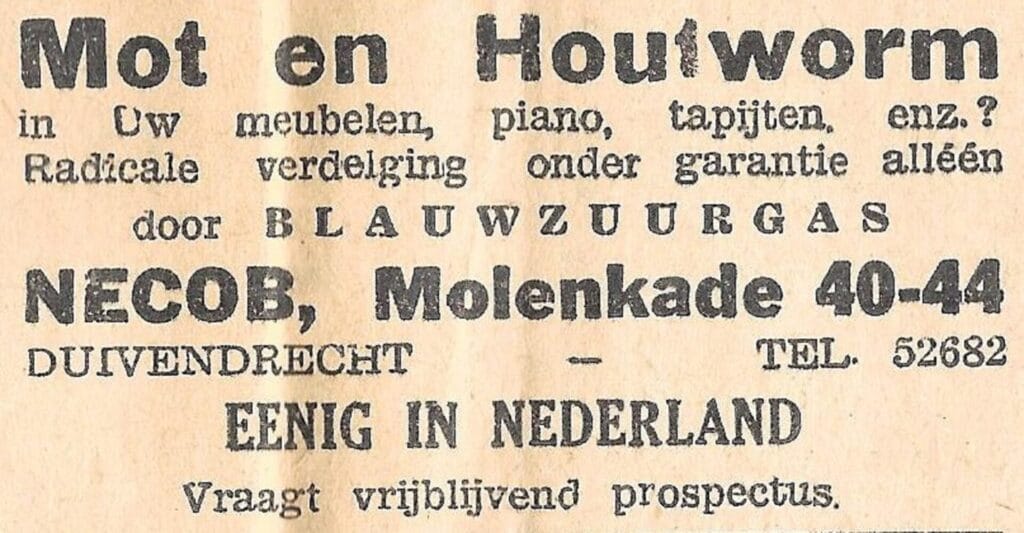 Het bedrijf de Necob had belangrijke klanten. Zo meldt het Rijksmuseum in 1989 dat een zaalwacht ‘beweging’ had gezien in een Japans houten beeld, dat een van de discipelen van de Boeddha voorstelt (14de eeuw, MAK 117). Naar bleek zaten er houtwormen in het beeld. Gelukkig was men er snel bij, zodat een adequate behandeling toegepast kon worden. Bij de Necob te Duivendrecht werden de wormen met methylbromide vergast. De schade werd tot een bijna onzichtbaar minimum beperkt. En bij veilinghuis Peerdeman werd in 2021 een donkergebeitst esdoorngefineerd halvemaantafeltje met gezwarte accenten, Louis Seize-stijl, geveild, met ‘gebruikssporen en oude houtwormgaatjes’. Het meubel was aan de onderkant gestempeld ‘Necob Duivendrecht’, die de ongediertebestrijding blijkbaar onder handen genomen had.