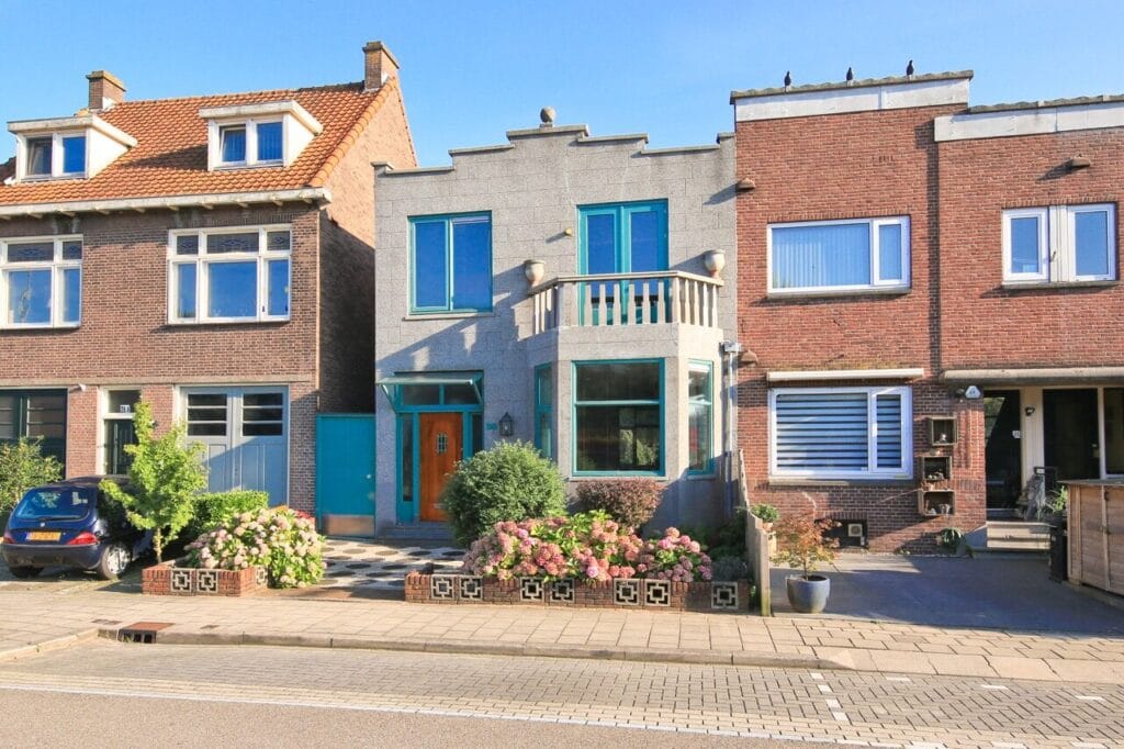 Op het eerste gezicht valt het huis misschien niet zo op: niet al te groot… niet al te breed… grijs metselwerk? Maar als je beter kijkt gaat er een en ander opvallen. Het huis heeft een flauwe trapgevel, er staat een bol bovenop en er staan twee stenen vazen aan weerszijden van het balkon. Ook is het geen metselwerk… het is graniet!