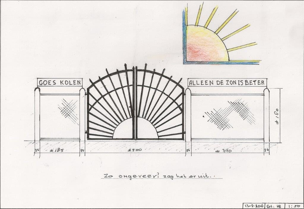 Het overslagterrein van Goes, of het ‘Landje van Goes’, lag langs de goederenspoorbaan, nu de busbaan, en werd afgesloten met een sierlijk hek, met opschrift: ‘Goes Kolen’, en ‘Alleen de zon is beter’. Centraal in het hek was een zon met een gele stralenkrans afgebeeld en het hekwerk was verder blauw. Het leuke is… twee steunpalen van het hek staan er nog altijd…