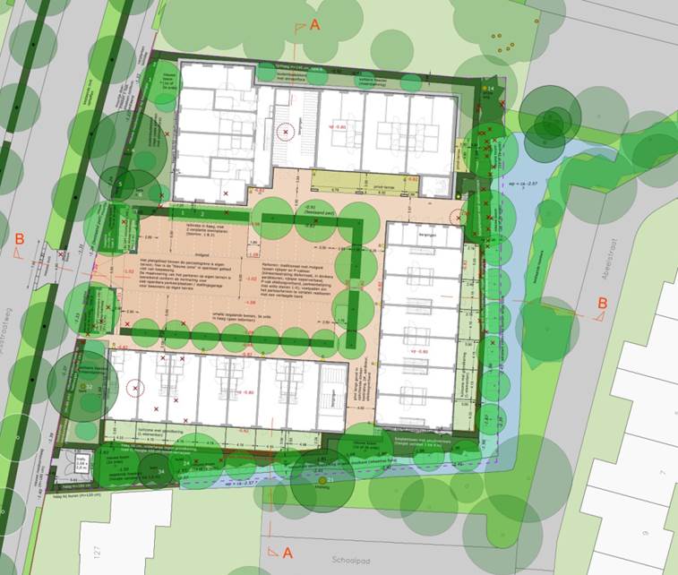Aan de zijde van de Abeelstraat voorziet het ontwerp in een haag en bomen op particulier terrein. Dit groen en de bijbehorende groene voile zijn uitgebreid besproken tijdens het participatietraject en vormen een essentieel onderdeel van het ontwerp. Lange tijd was echter onduidelijk hoe het behoud van dit groen in de toekomst juridisch zou worden geborgd, aangezien bomen gekapt en hagen verwijderd kunnen worden.
